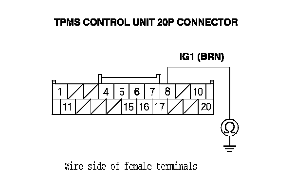 7. With the No. 5 (7.5 A) fuse removed, check for continuity between body ground and the TPMS control unit 20P connector terminal No. 8.