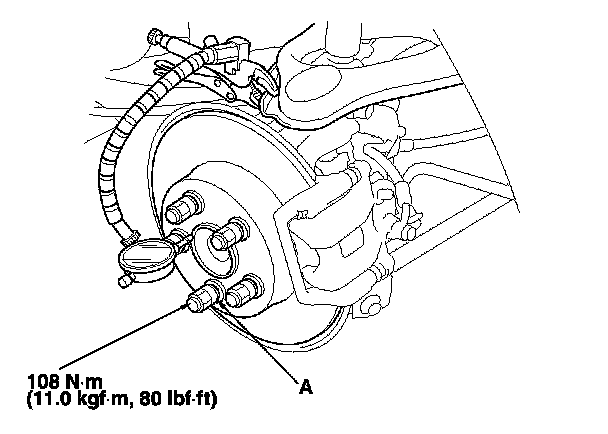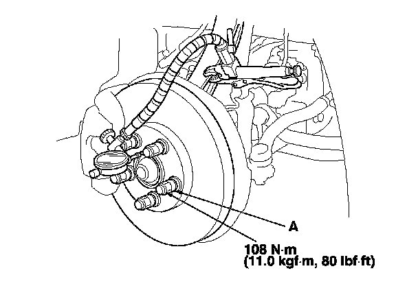 3. Install suitable flat washers (A) and the wheel nuts. Tighten the nuts to the specified torque to hold the brake disc securely against the hub.
