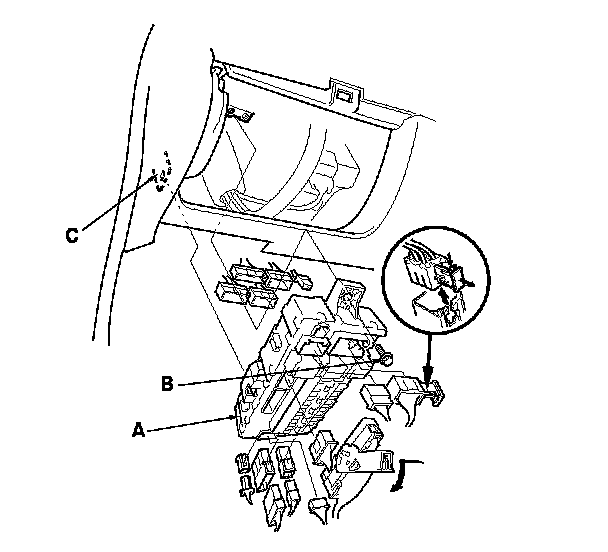 4. Remove the mounting bolt (B) and release the tab (C), and then pull the driver's under-dash fuse/relay box away from the body.