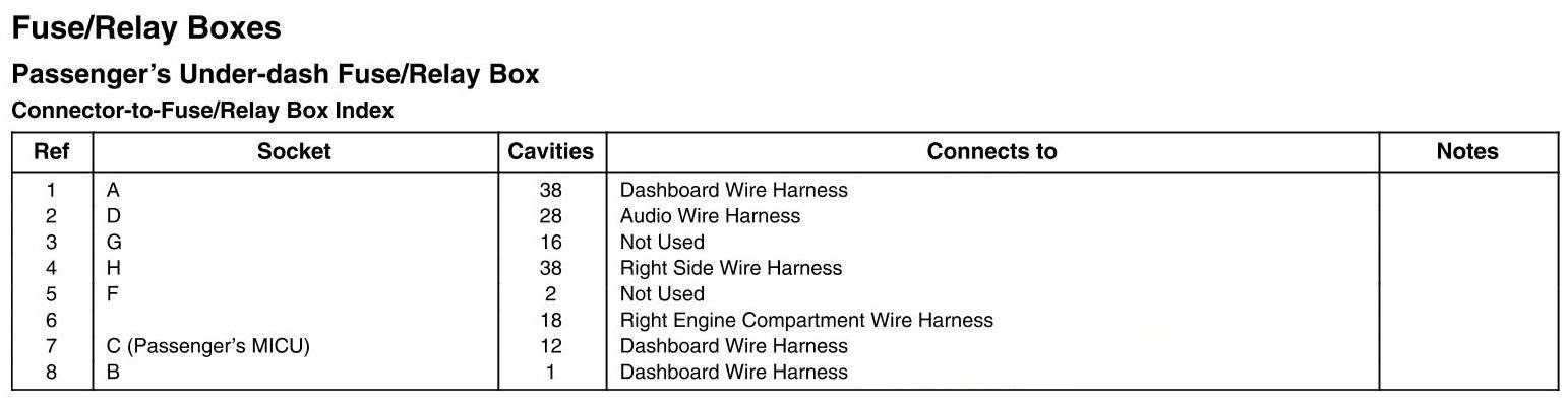 Passenger's Under-dash Fuse/Relay Box - Connector-to-Fuse/Relay Box Index