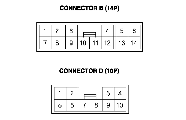 There should be continuity between terminals D1 and D4 when battery power is connected to terminal B7 (or B8), and body ground is connected to terminal D10. There should be no continuity between terminals D1 and D4 when power is disconnected.