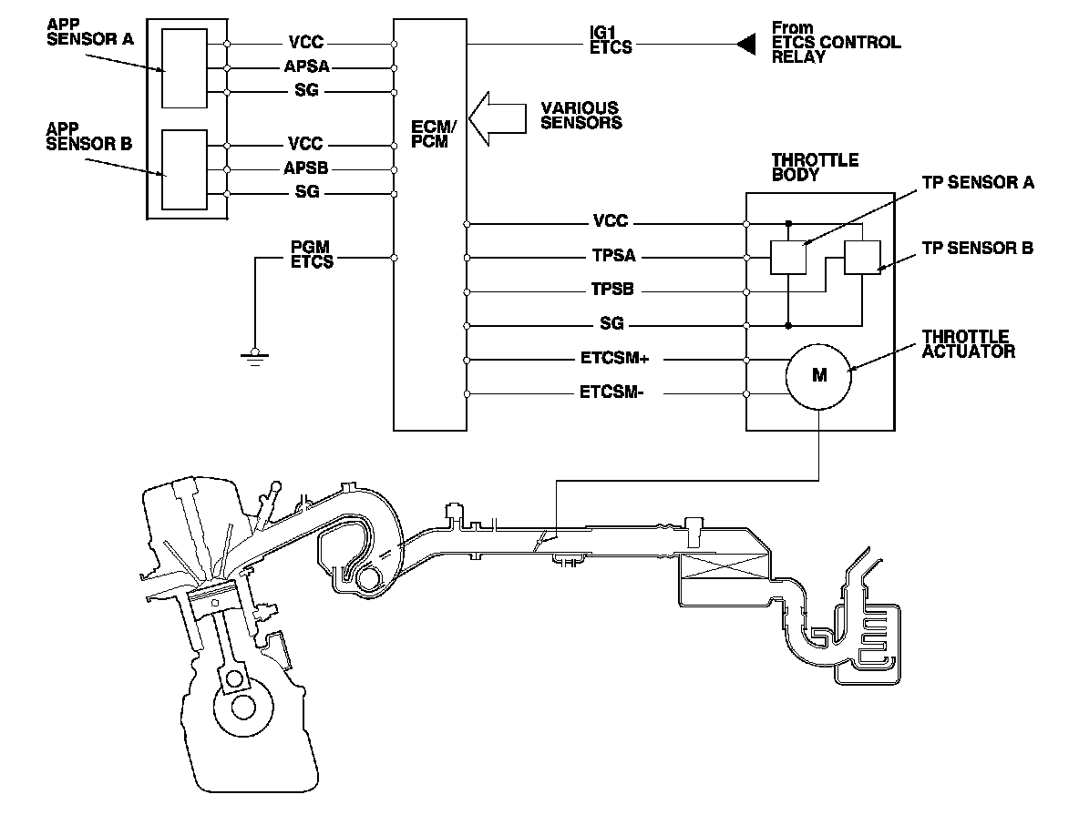 The electronic throttle control system consists of the throttle actuator, throttle position (TP) sensor A/B, accelerator pedal position (APP) sensor A/B, the electronic throttle control system (ETCS) control relay, and the ECM/PCM.