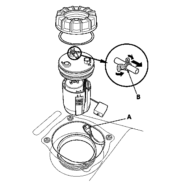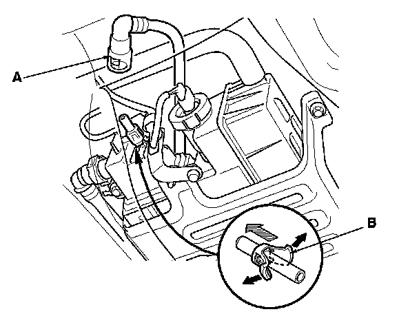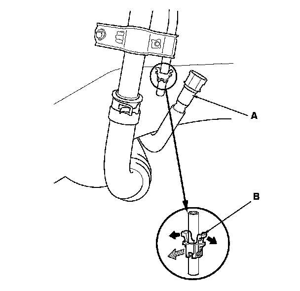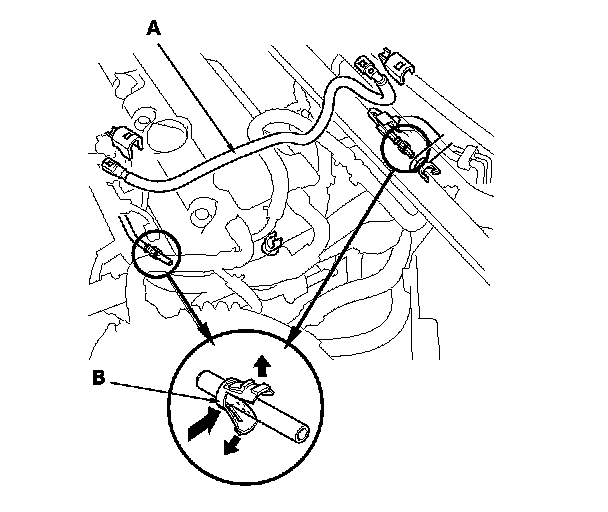 3. Before connecting a new fuel tube/quick-connect fitting assembly (A), remove the old retainer (B) from the mating line.