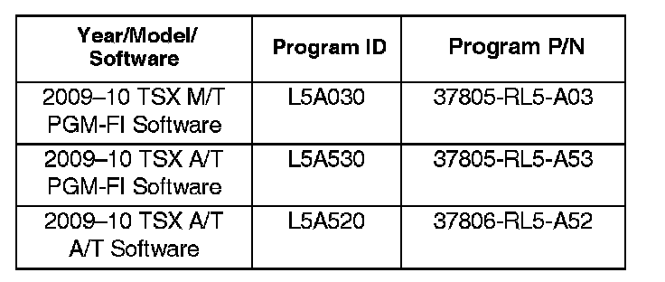 The updated PGM-FI software program IDs and P/Ns are shown below. If these or a later program IDs are the current ones displayed during the update, the software for this service bulletin is already installed.