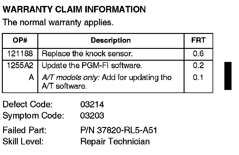 *Replace the knock sensor, then update the PGM-FI software. If you're working on a vehicle with A/T, also update the A/T software.*