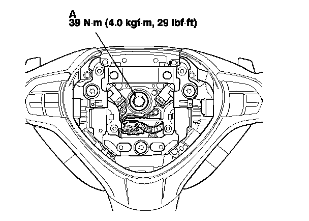 8. Install the steering wheel bolt (A), and tighten it to the specified torque, then connect the cable reel subharness 20P connector.