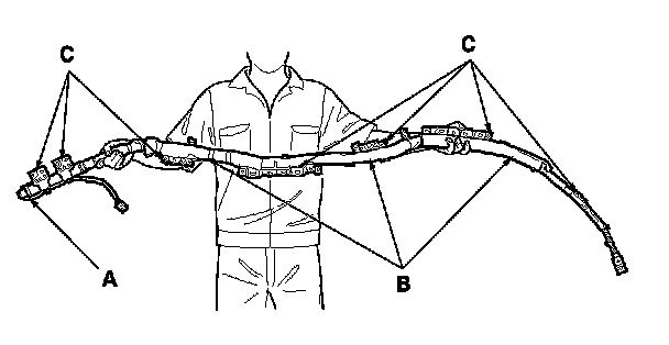 - The side curtain airbag module assembly is a long, jointed part containing an inflator (A), a flexible bag (B), and brackets (C). When removing or installing the side curtain airbag inflator assembly, never do these things: