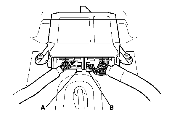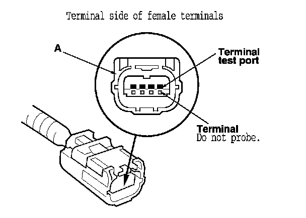 When diagnosing or troubleshooting at an SRS unit connector (A), use the terminal test port below the terminal you need to check. Gently insert the pin probes of the tester or jumper wire at the terminal test port from the terminal side.