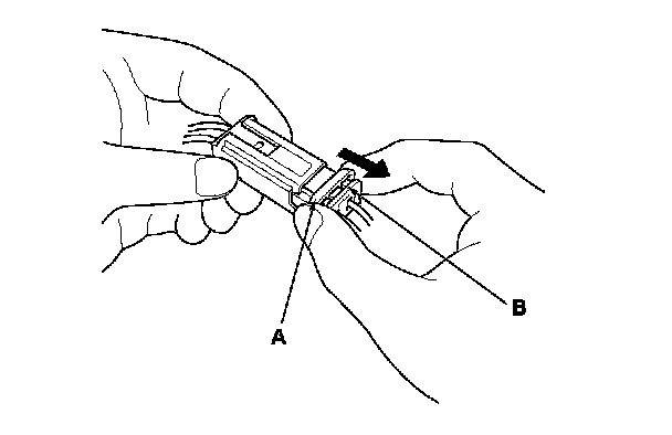 To reconnect, hold the pawl-side connector, and press on the back of the sleeve-side connector in the direction shown. As the two connector halves are pressed together, the sleeve (A) is pushed back by the pawl (B). Do not touch the sleeve.