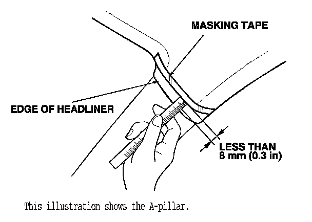 To prevent the side curtain airbag from deploying and damaging the pillar trim, the overlap between the headliner and pillar trim must be less then 8 mm (0.3 in). To check the overlap, do this: