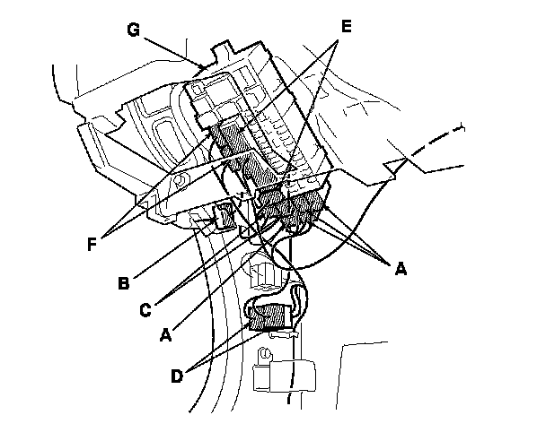 3. From under the dash, disconnect the left engine compartment wire harness connectors (A), the driver's door wire harness connector (B), the roof wire harness connectors (C), and the left side wire harness connectors (D). Disconnect the left engine compartment wire harness connectors (E) and the left side wire harness connectors (F) from the driver's under-dash fuse/relay box (G).