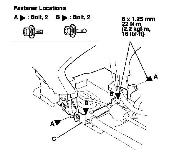 12. Remove the center frame mounting bolts (A) and the center joint mounting bolts (B), then remove the center joint bracket (C).