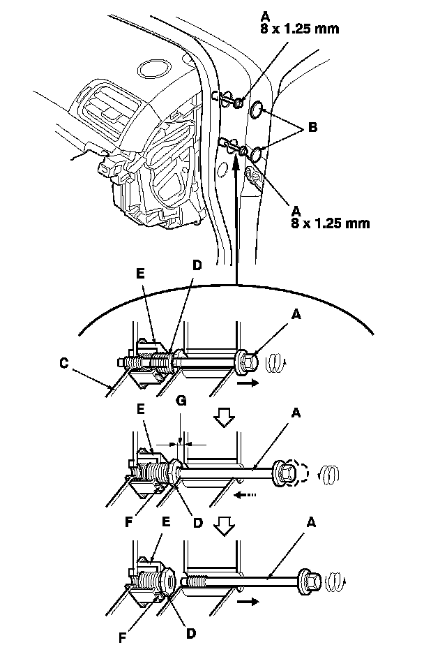 -3 Continue loosening the special bolts to turn the collar bolts into the fixed space adjusters (E) until the collar bolts engage the stoppers (F). This creates a gap (G) between the collar bolts and the body.