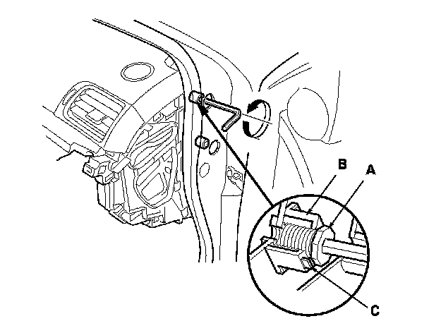 - Make sure the collar bolts (A) turn easily by hand in the fixed space adjusters (B). Tighten the collar bolts by hand until they engage the stoppers (C) before reinstalling the dashboard.