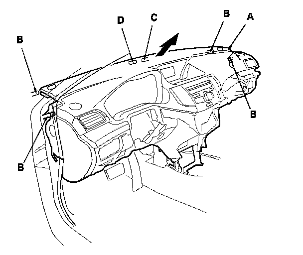 16. Lift up on the dashboard (A) to release it from the guide pins (B) and the center pin (C) on the dashboard from the grommet (D). Carefully remove the dashboard through the front door opening.