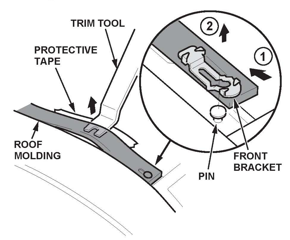 1. Using the appropriate trim tool, slide the roof molding rearward to release the front bracket from the pin and pull up on the front portion of the molding.