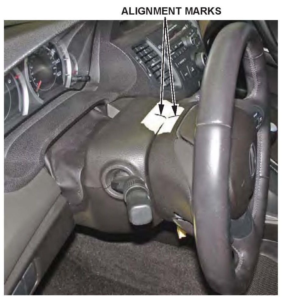 2. Place a piece of masking tape on top of the steering wheel hub, then place another piece of tape on the steering column cover. Draw a line connecting both tapes; this will help you align the steering wheel when you reinstall it.