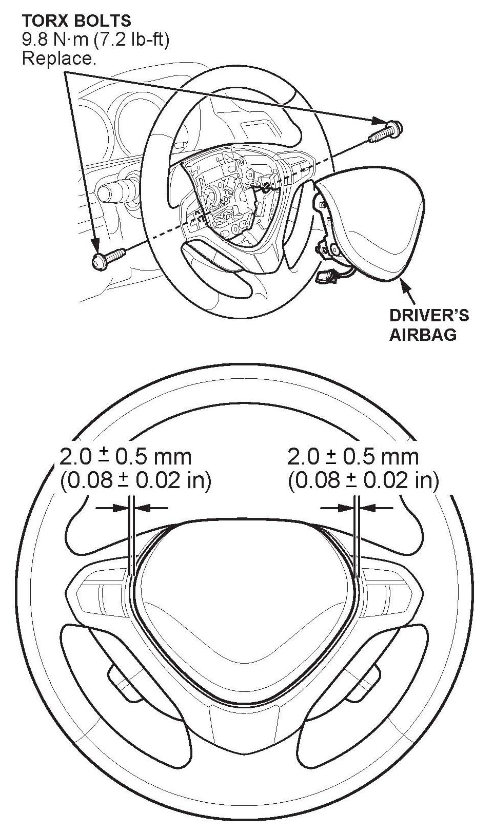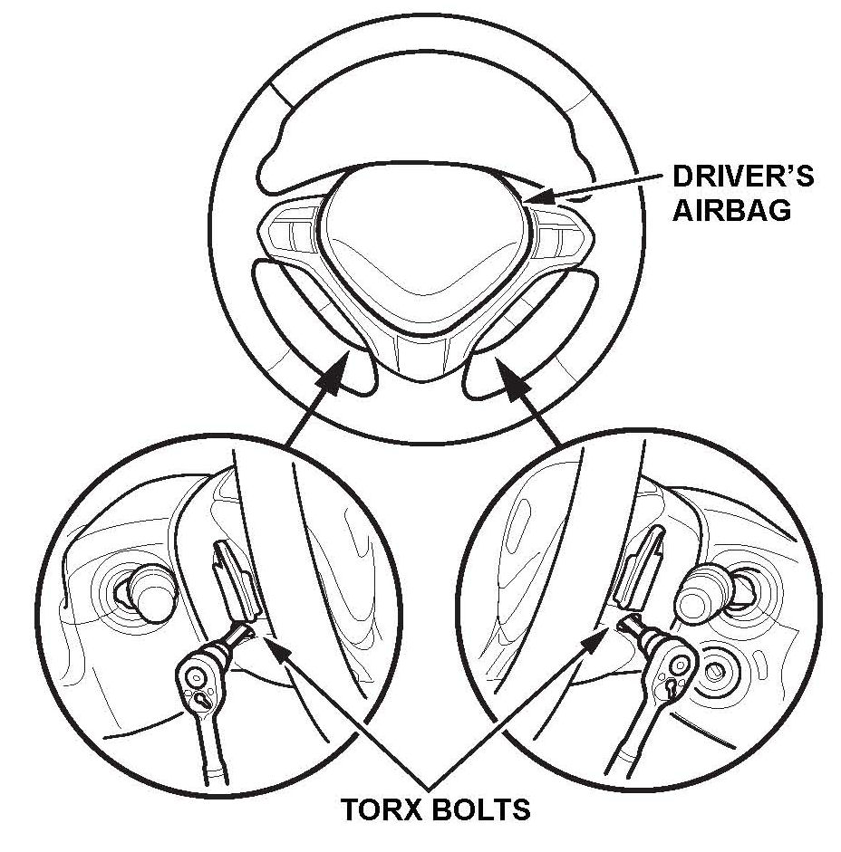 23. Install the driver's airbag into the steering wheel, and tighten the new TORX bolts to 9.8 N.m (7.2 lb-ft), using a TORX T30 bit.
