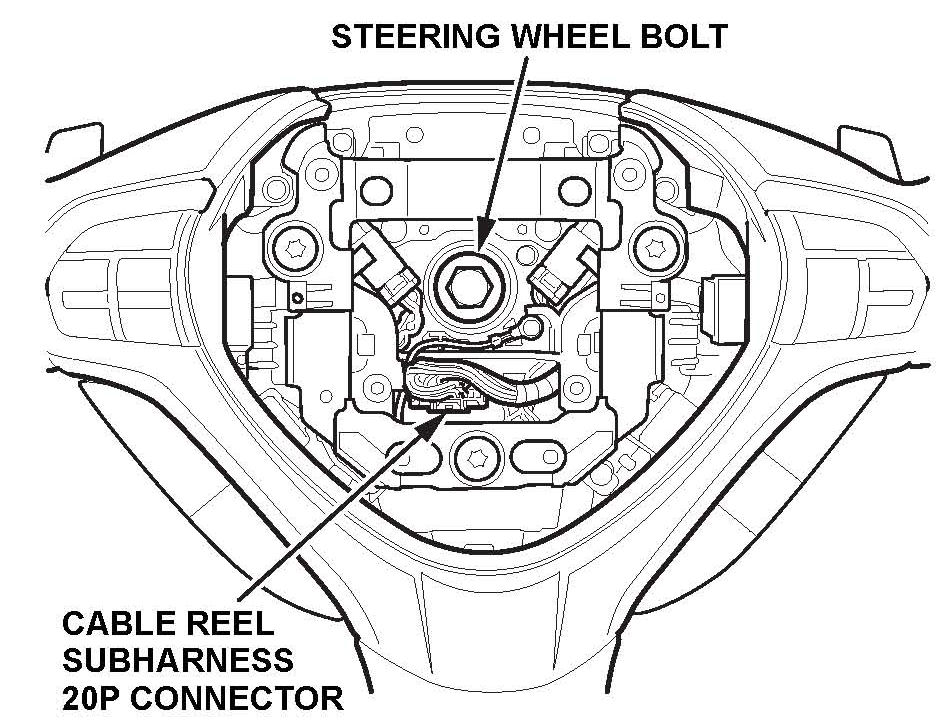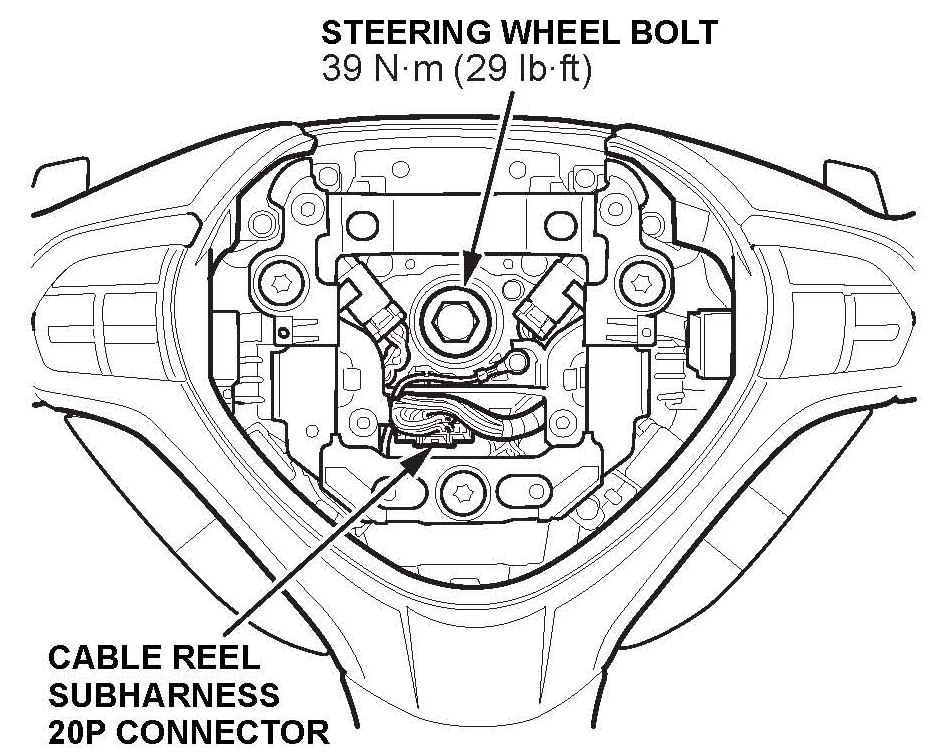 22. Align the steering wheel with the marks you drew on the masking tape created in step 2. Install the steering wheel bolt, and torque it to 39 N.m (29 lb-ft). Connect the cable reel subharness 20P connector. Make sure the wire harness is routed and fastened properly.