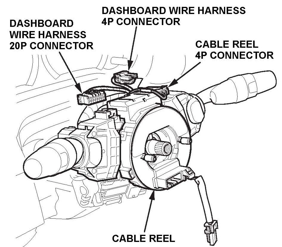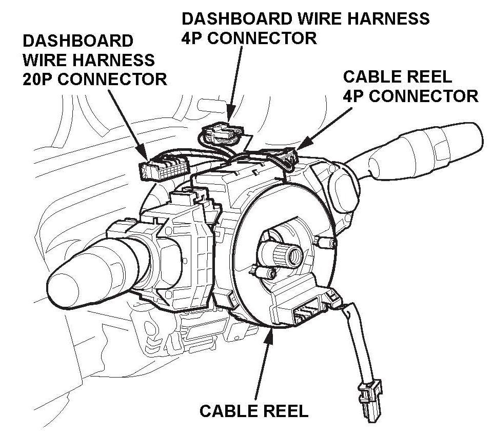 19. Reconnect the dashboard wire harness 4P connector to the cable reel 4P connector, then reconnect the dashboard wire harness 20P connector to the cable reel.