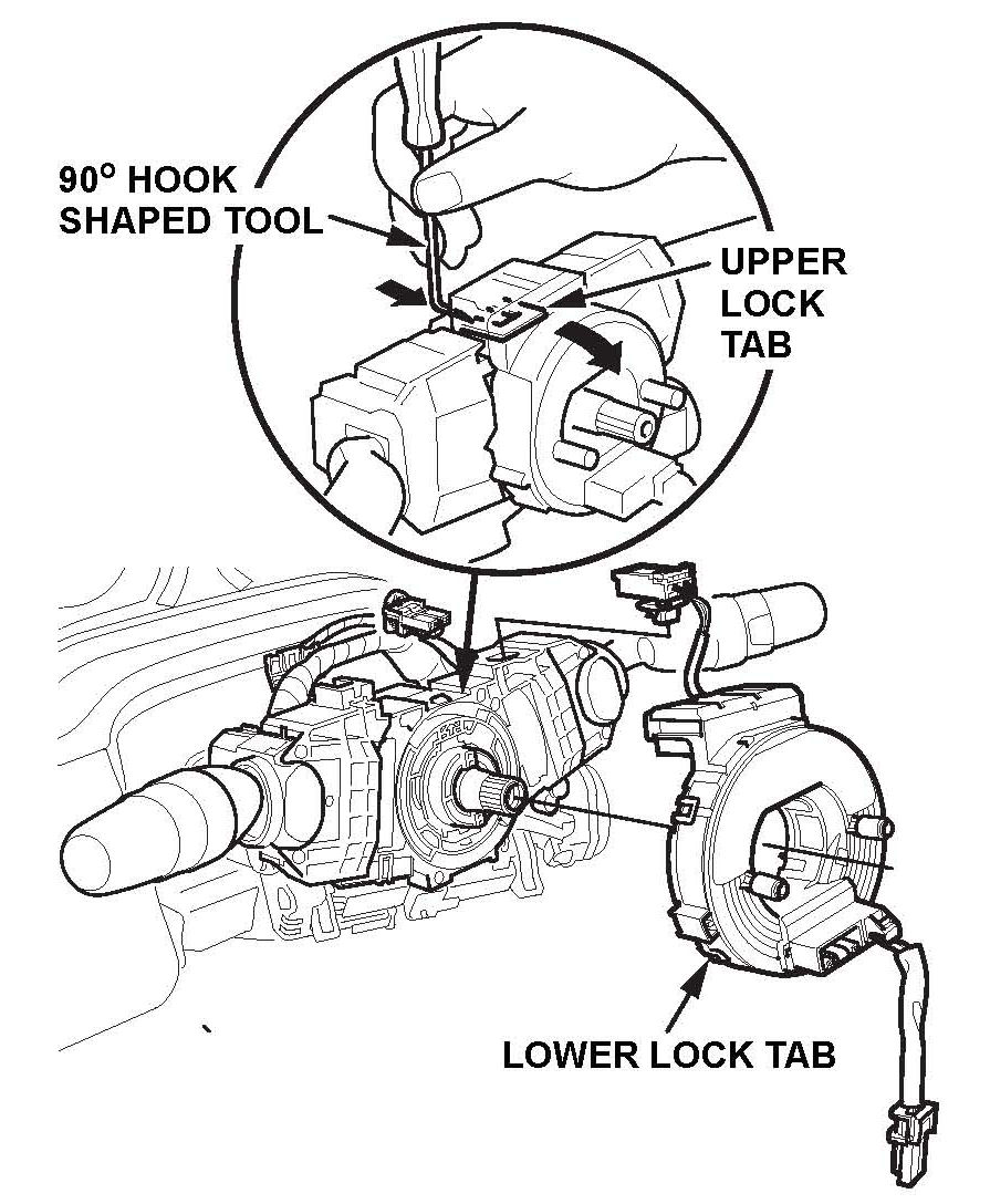 11. Release the upper lock tab under the cable reel connector with a 900 hook-shaped tool. Slide the tool below the cable reel connector just above the lock tab. Release the lower lock tab, and slide the cable reel off the column.