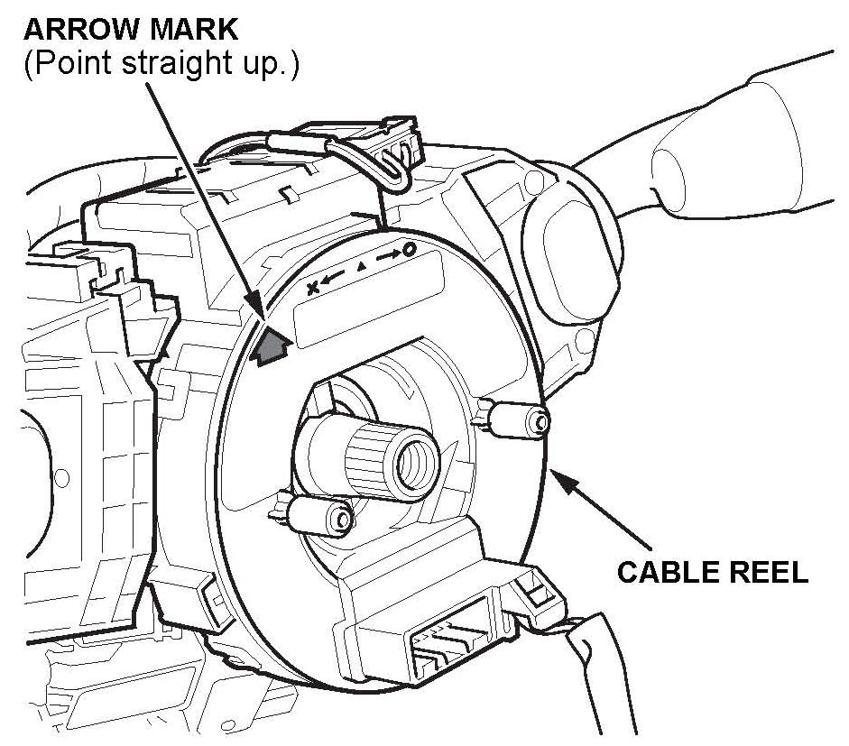18. Reinstall the cable reel. Center the cable reel if it was turned after removing it from the column. Do this by first rotating the cable reel clockwise until it stops. Then, rotate it counterclockwise about three full turns. The arrow mark on the cable reel label should point straight up.
