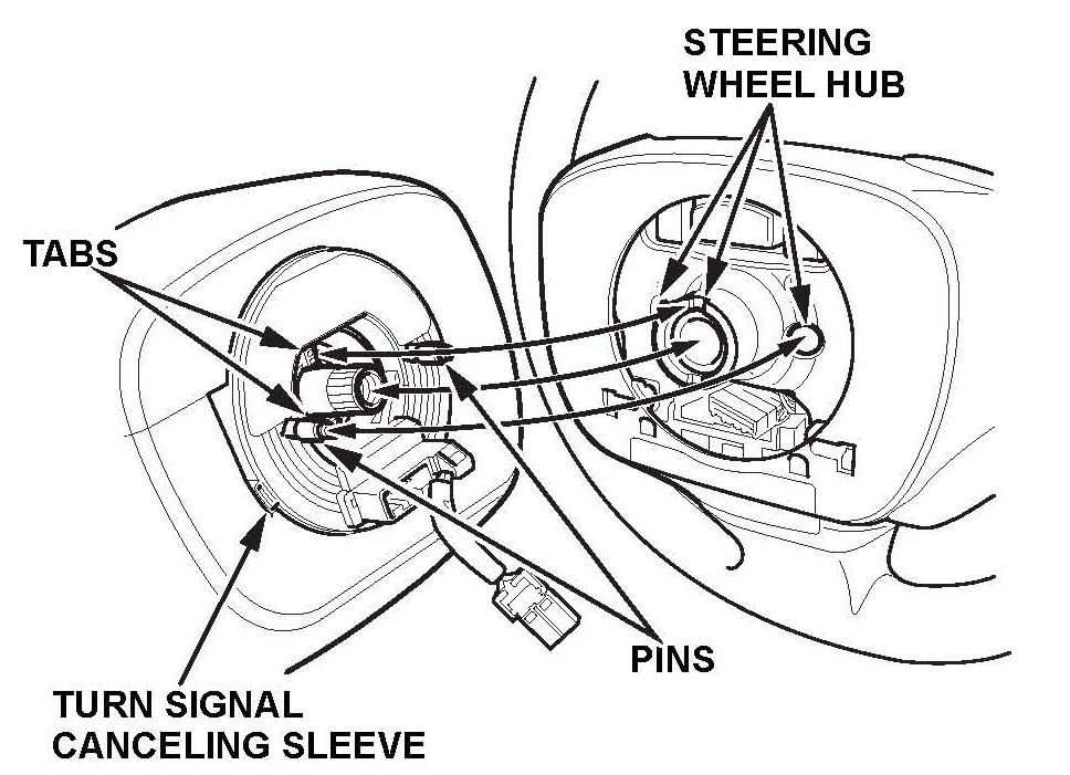 21. Position the two tabs of the turn signal canceling sleeve as shown. Install the steering wheel on the steering column shaft; make sure the steering wheel hub engages the pins of the cable reel and tabs of the turn signal canceling sleeve. Do not tap on the steering wheel or steering column shaft when installing the steering wheel.