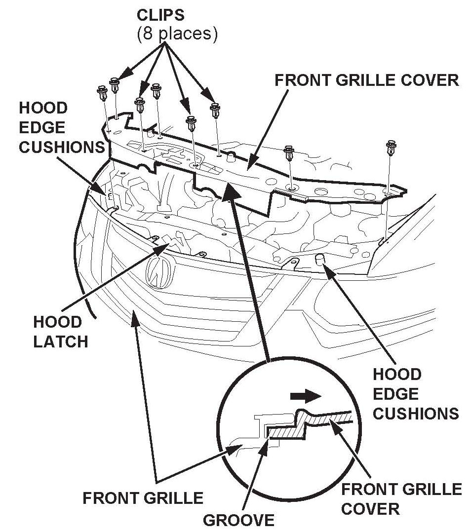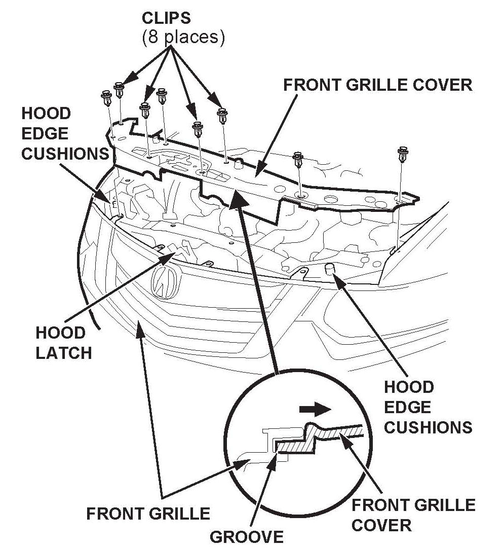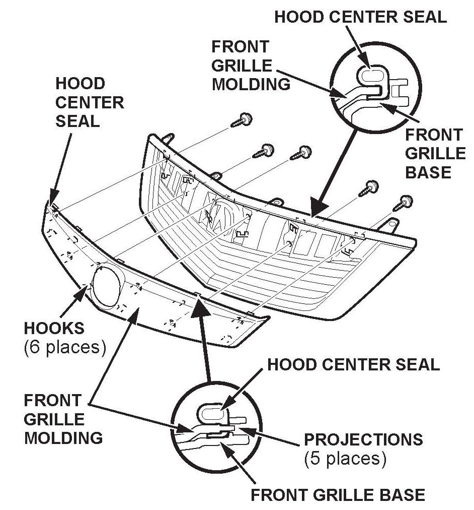 8. Remove the front grille molding by removing the screws, releasing the hooks (six places) from the grille base, and releasing the projections (five places) from the hood center seal.