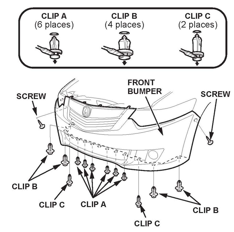 6. Remove the grille by removing the screws, detaching the clips, and releasing the hooks and ribs from the bumper.