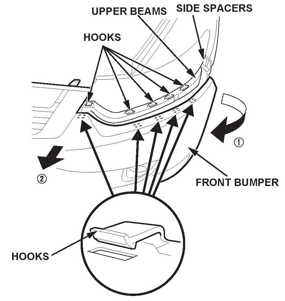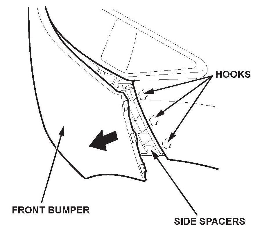 4. With the help of an assistant, pull both sides of the bumper away from the side spacers. Then pull the bumper out to release the hooks from the upper beams.