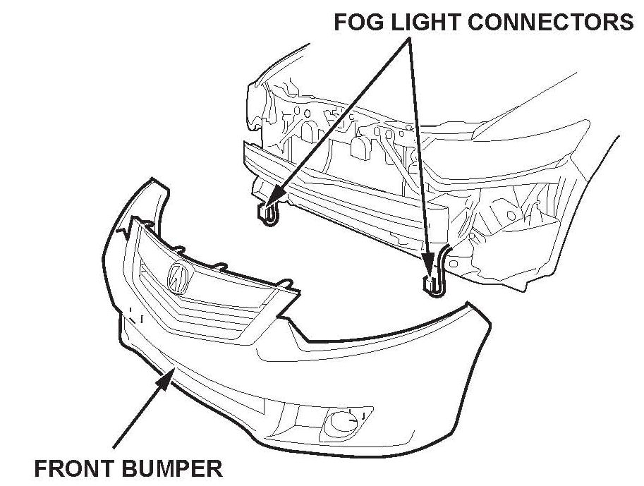 5. With the help of an assistant, disconnect the fog light connectors while holding the bumper, then remove the bumper.