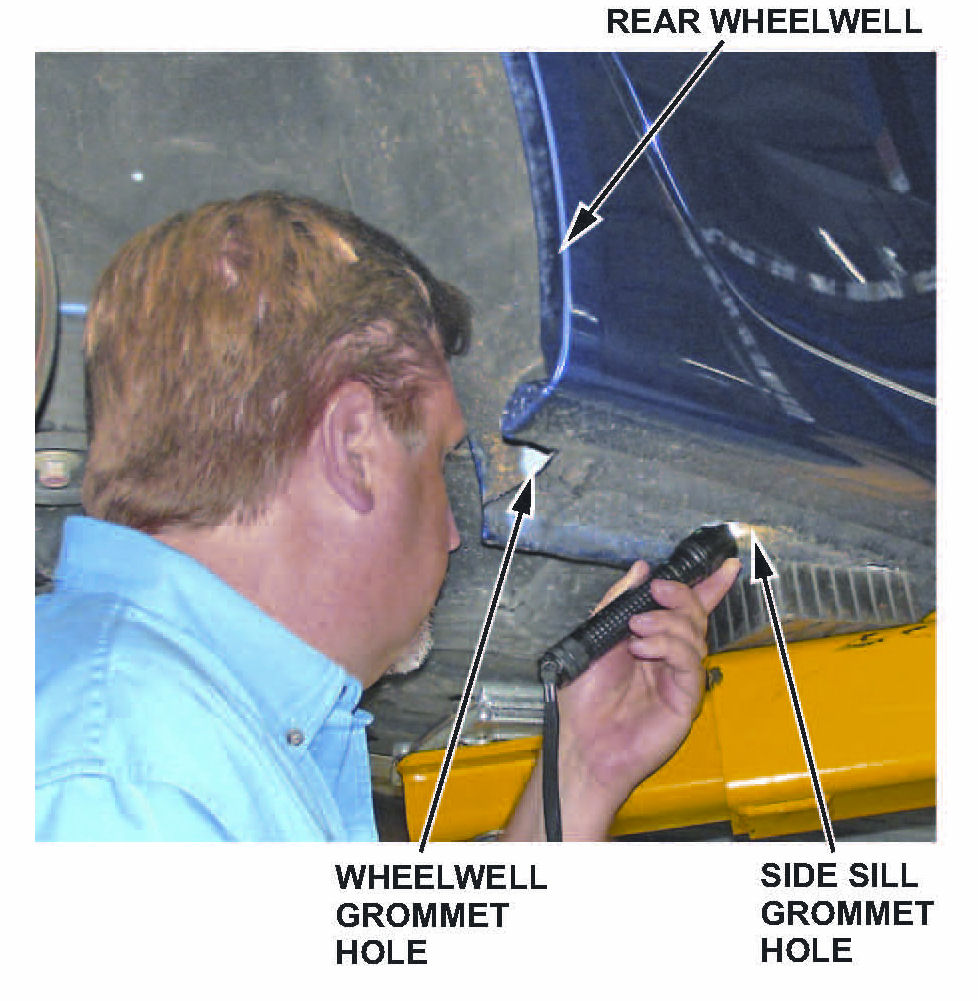 1. On the affected side, remove the grommet from the wheelwell, and the grommet from the bottom of the side sill. Shine a light through the side sill grommet hole so you can see inside through the wheelwell grommet hole.