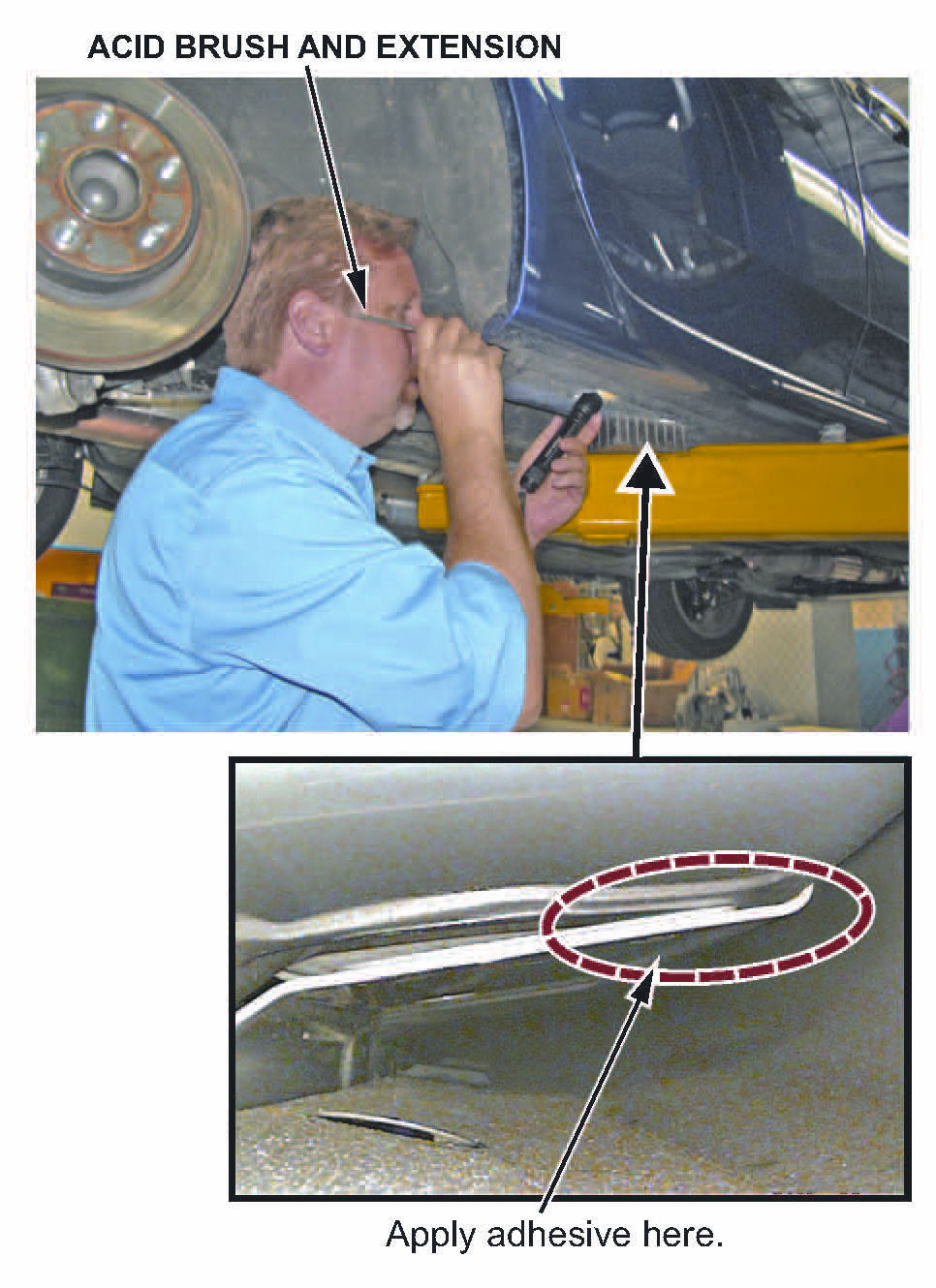 3. Using an acid brush and an extension, apply the adhesive through the wheelwell grommet hole and between the sheet metal at the insertion point shown. (The insertion point should be as far outboard as possible.) Allow the adhesive to become tacky.