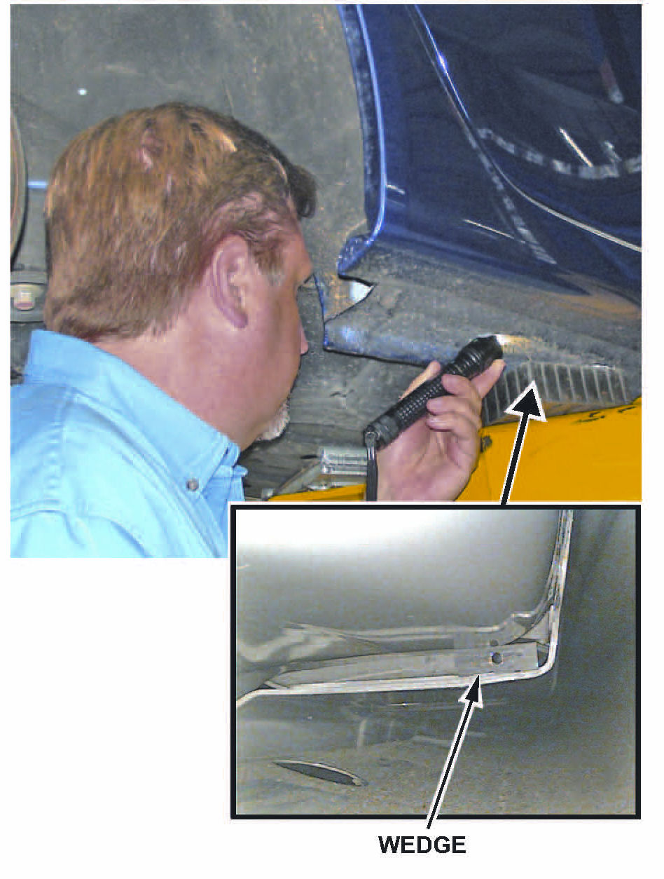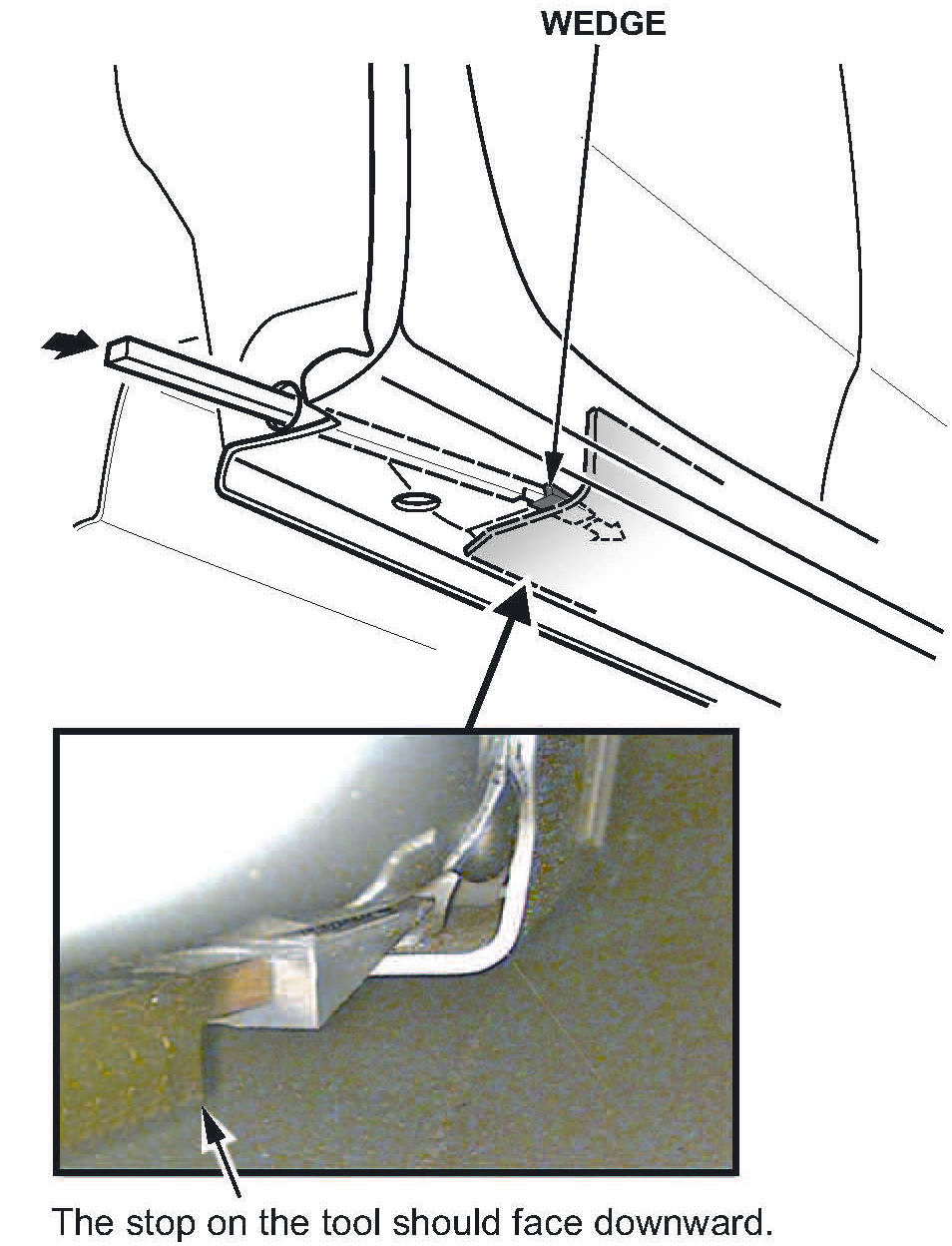 5. Insert the wedge through the wheelwell hole and into the insertion point by hand. Make sure the stop on the installation tool is pointing down. (The wedge is shown without adhesive.)