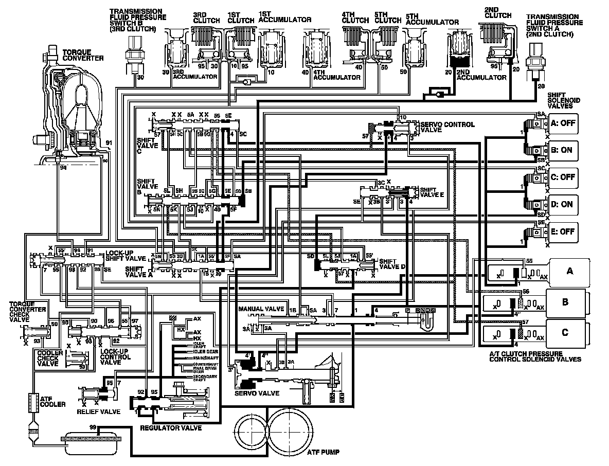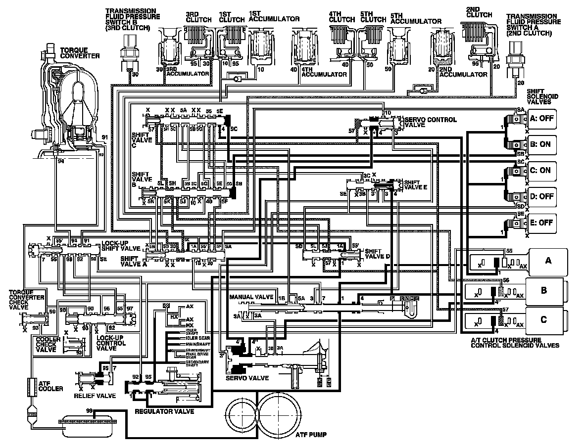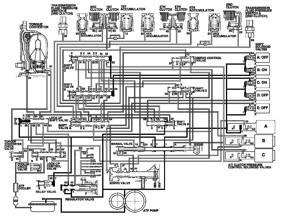 As the speed of the vehicle reaches the programmed value, the PCM turns shift solenoid valve C OFF, and A, B, D, and E remain OFF. Shift solenoid valve C pressure (SC) in the right side of shift valve C is released. Shift valve C is moved to the right side uncovering the A/T clutch pressure control solenoid valve B and C pressure ports leading to the 3rd and 4th clutches. The PCM actuates the A/T clutch pressure control solenoid valves to regulate hydraulic pressure. A/T clutch pressure control solenoid valve C pressure (57) changes to 3rd clutch pressure (30) at shift valve A. A/T clutch pressure control solenoid valve B pressure (56) changes to (5G) at shift valve C, and becomes 4th clutch pressure (40) at shift valve B. The 3rd and 4th clutches are engaged gently.