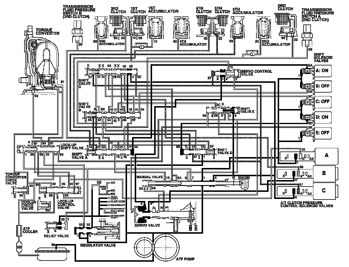 As the speed of the vehicle reaches the programmed value, the PCM turns shift solenoid valve D ON, A remains ON, and B, C, and E remain OFF. Shift solenoid valve D pressure (SD) is applied to the left side of shift valve D. Shift valve D is moved to the right side uncovering the A/T clutch pressure control solenoid valve C pressure port leading to the 5th clutch. The PCM controls the A/T clutch pressure control solenoid valves to regulate hydraulic pressure. A/T clutch pressure control solenoid valve B pressure (56) changes to 4th clutch pressure (40) at shift valve B. A/T clutch pressure control solenoid valve C pressure (57) changes to (5L) at shift valve D and to (5N) at shift valve B, and becomes 5th clutch pressure (50) at shift valve A. The 4th and 5th clutches are engaged gently.