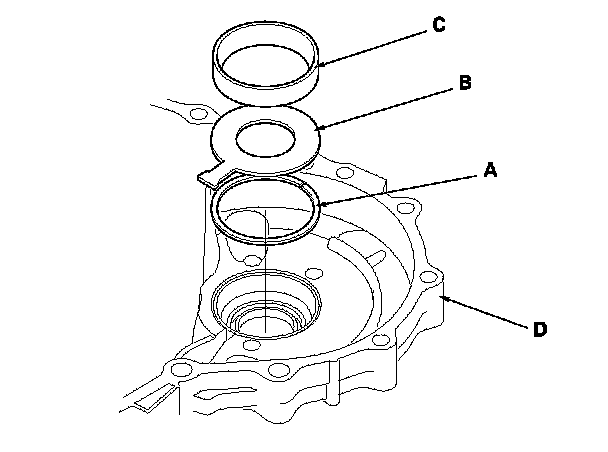 5. Install the 76 mm thrust shim (A), the 76.2 mm thrust washer (B), and a new bearing outer race (C) in the transmission housing (D).