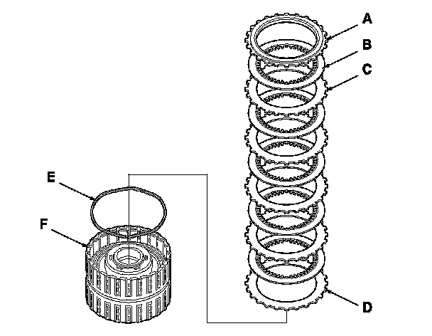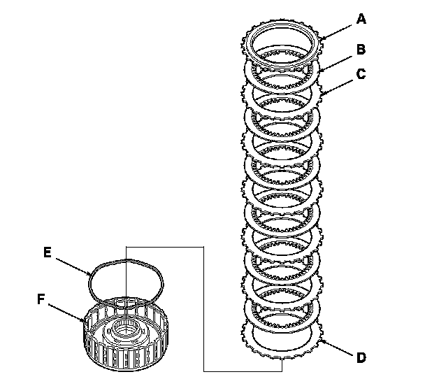 2. Remove the clutch end-plate (A), the clutch discs (B) (5), the clutch wave-plates (C) (4), the clutch flat-plate (D), and the waved spring (E) from the 1st clutch drum (F).