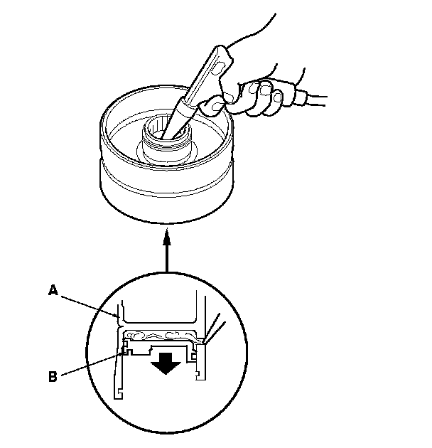 18. Wrap a shop rag around the clutch drum (A), and apply air pressure to the fluid passage to remove the piston (B). Place a finger tip on the other passage while applying air pressure.