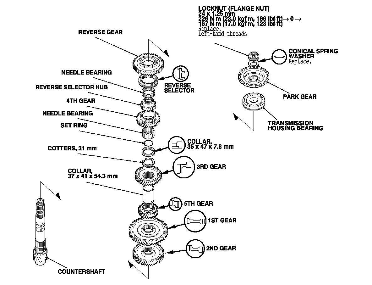 6. Replace the locknut and the conical spring washer with new ones when assembling the transmission. The countershaft locknut has left-hand threads.