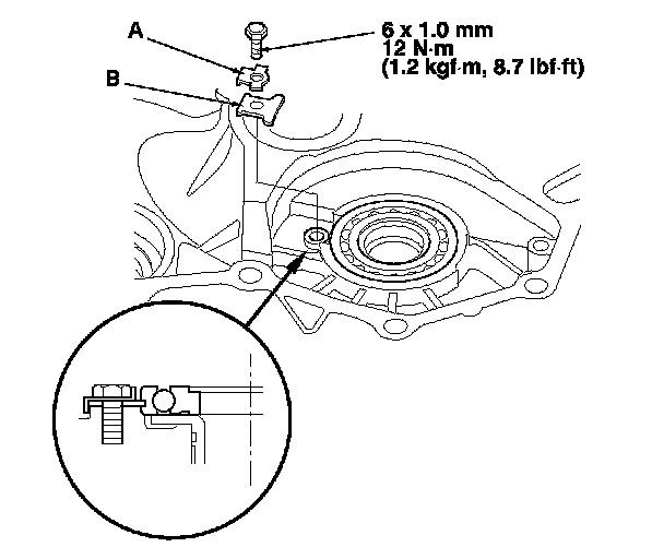 1. Remove the set plate bolt, then remove the lock washer (A) and the bearing set plate (B).