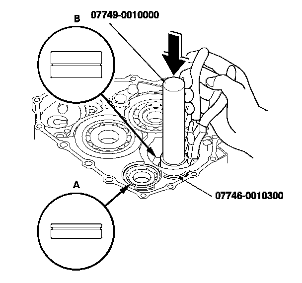 2. Expand each snap ring using snap ring pliers, and install the mainshaft bearing (A) and the countershaft bearing (B) part-way into the transmission housing using the driver handle and the 78 x 80 mm attachment.
