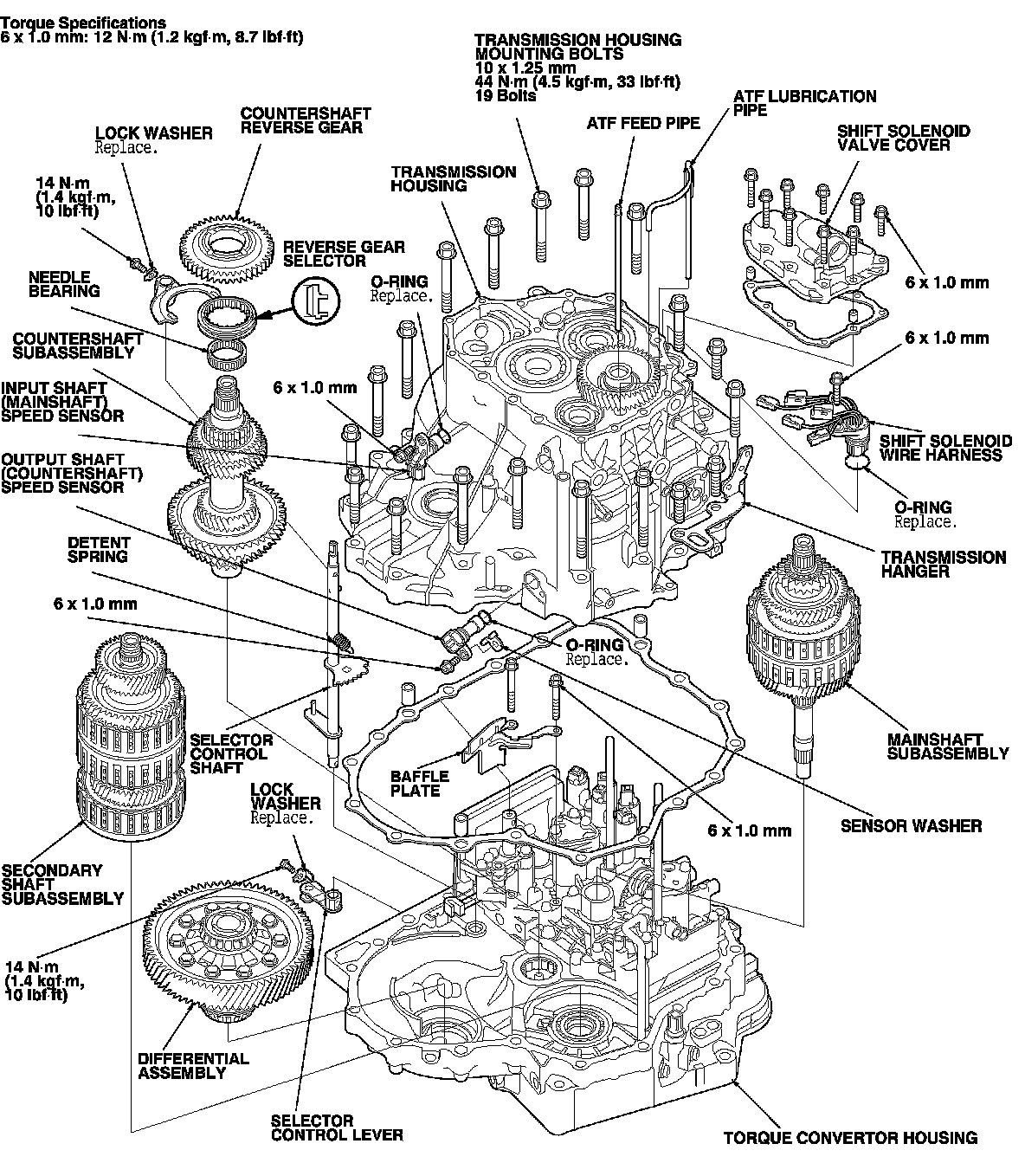 18. Install the transmission housing mounting bolts, and tighten the 19 bolts to 44 N-m (4.5 kgf-m, 33 lbf-ft) in at least two steps, in a crisscross pattern.