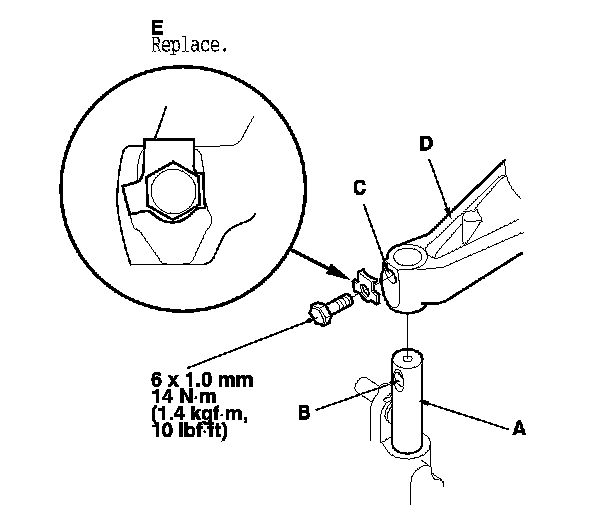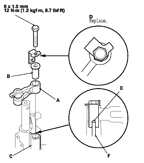 6. If the detent arm was removed, install the detent arm (A) with the arm collar (B) on the servo body (C), and install a new lock washer (D) by aligning its cutout (E) with the projection (F) of the servo body. Install and tighten the bolt, then bend the lock tab of the lock washer against the bolt head.