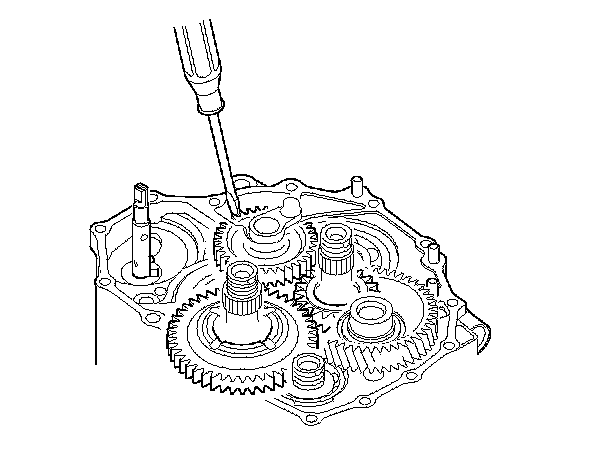 17. Wrap a screwdriver tip with tape to prevent damage to the reverse idler gear teeth. Engage the reverse idler gear with reverse gears by rotating the reverse idler gear using the screwdriver.