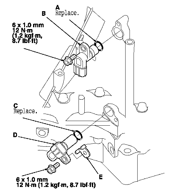 20. Install a new O-ring (C) on the output shaft (countershaft) speed sensor (D), and install the output shaft (countershaft) speed sensor with the sensor washer (E) in the transmission housing.