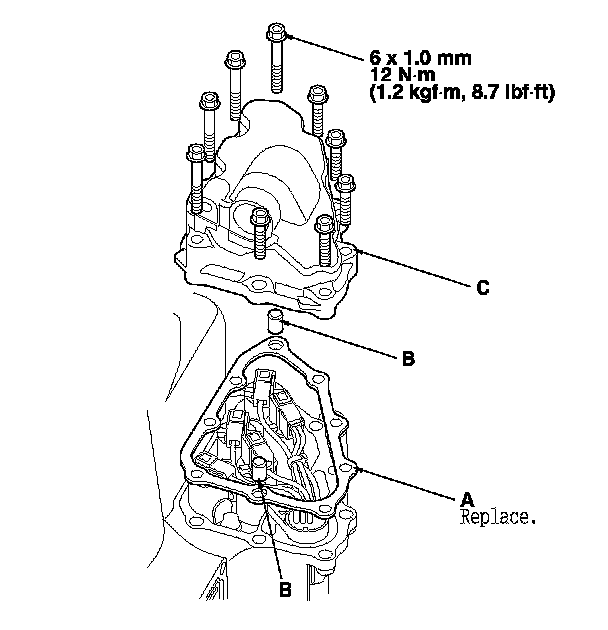 23. Install a new gasket (A) and the two dowel pins (B), then secure the shift solenoid valve cover (C) with the bolts.