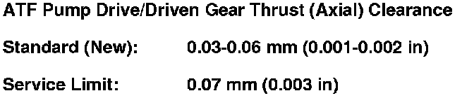 3. Remove the ATF pump driven gear shaft. Measure the thrust clearance between the ATF pump driven gear (A) and the main valve body (B) using a straight edge (C) and a feeler gauge (D).