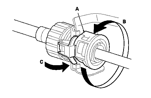 5. Rotate the socket holder retainer (A) counterclockwise (B) until it stops, and push the retainer lock (C) into the socket holder retainer to lock the retainer.