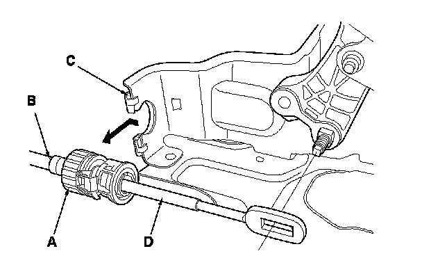 6. Slide the socket holder (A) away from the bracket as shown to remove the shift cable (B) from the shift cable bracket (C). Do not remove the shift cable by pulling the shift cable guide (D).